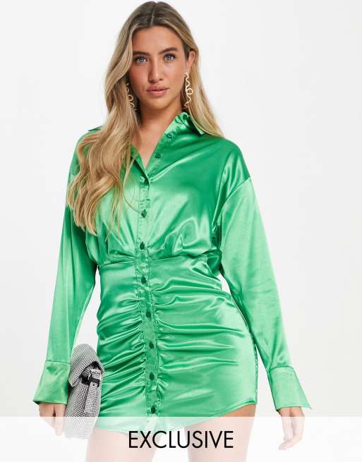 Sage Green Satin Fitted Shirt Dress Dresses Prettylittlething